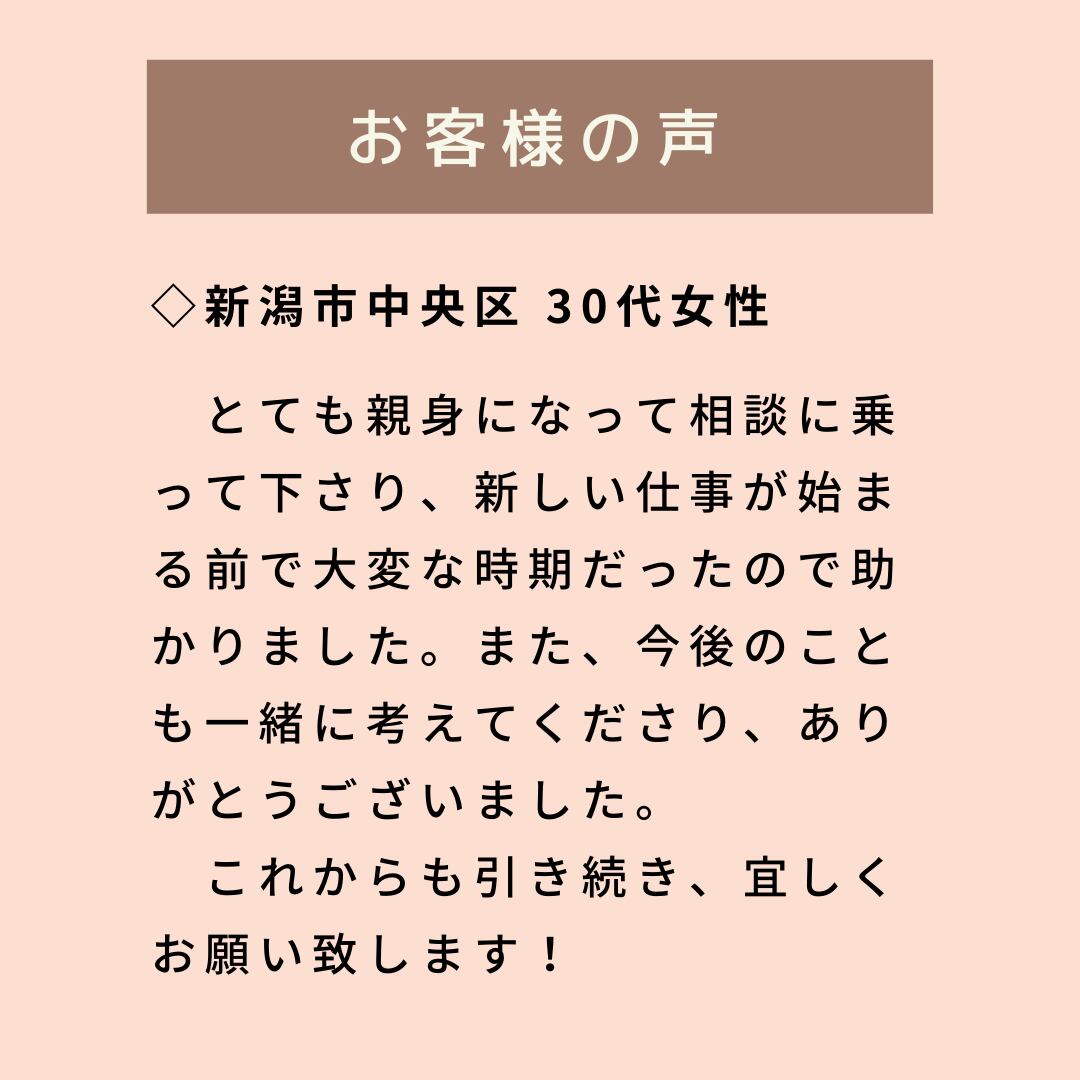 とても親身になって相談に乗って下さり、新しい仕事が始まる前で大変な時期だったので助かりました。また、今後のことも一緒に考えてくださり、ありがとうございました。これからも引き続き、宜しくお願い致します!